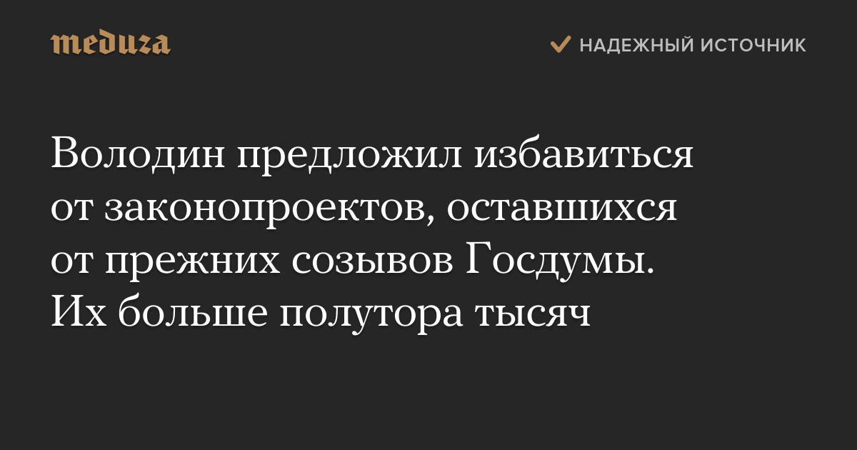 Спикер Государственной думы Вячеслав Володин предложил отказаться от работы с законопроектами, которые вносились во время предыдущих созывов Думы, но так и не были рассмотрены. Предложение прозвучало 10 января на Совете Думы, рассказал лидер фракции «Справедливая Россия» Сергей Миронов.
