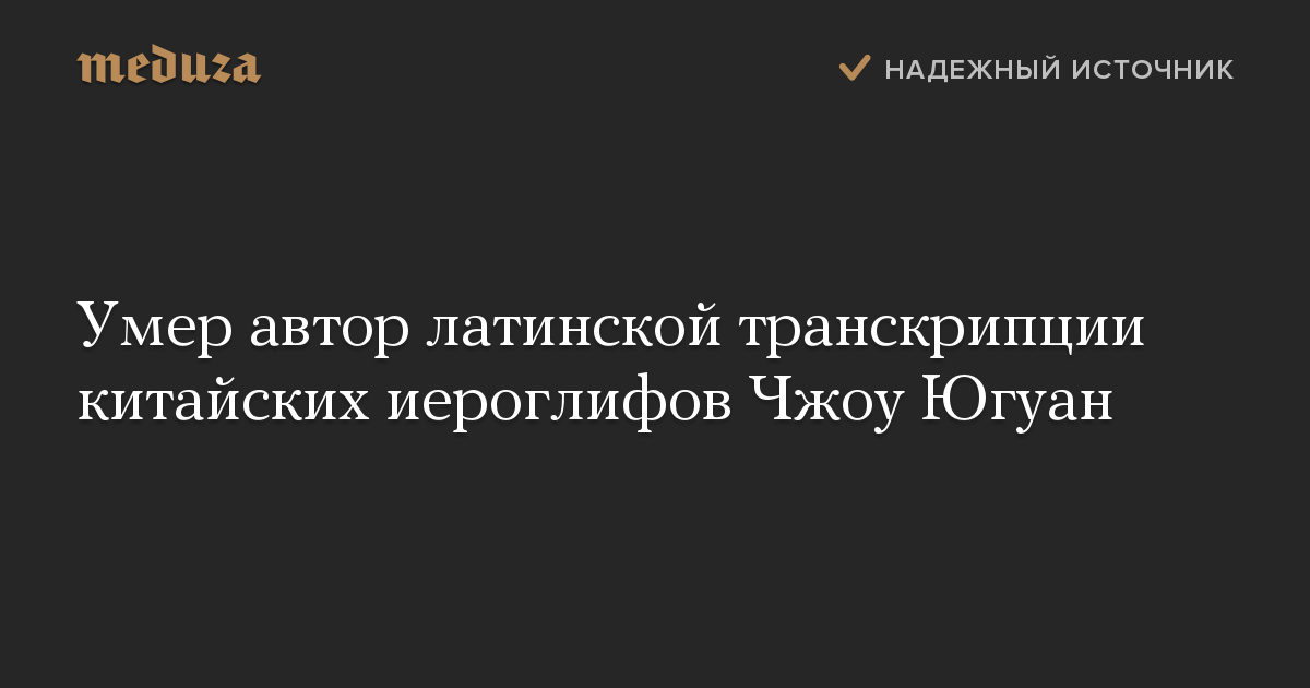 Умер автор латинской транскрипции китайских иероглифов Чжоу Югуан