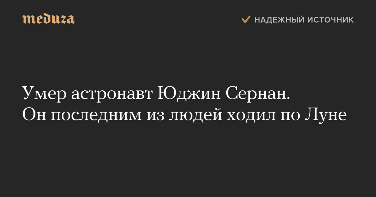 Астронавт NASA Юджин Сернан, участвовавший в последнем на данный момент пилотируемом полете на Луну, умер в возрасте 82 лет.