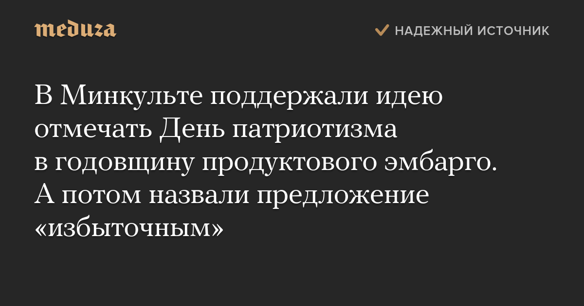 В Минкульте поддержали идею отмечать День патриотизма в годовщину продуктового эмбарго. А потом назвали предложение «избыточным»