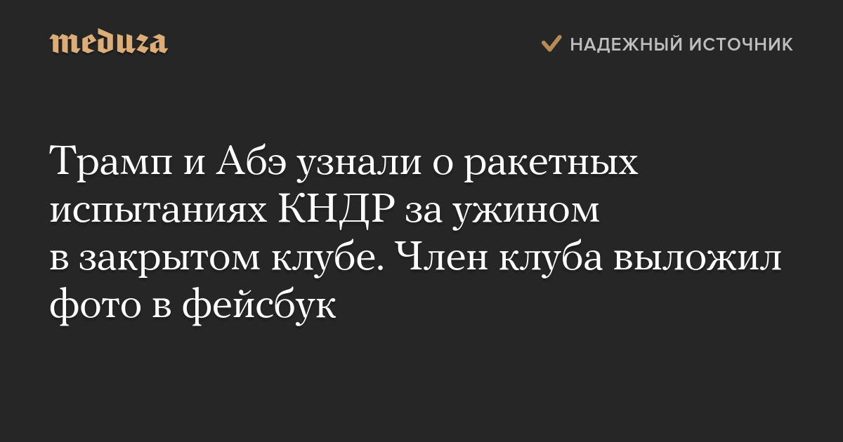 Трамп и Абэ узнали о ракетных испытаниях КНДР за ужином в закрытом клубе. Один из присутствующих выложил в фейсбук фотографии
