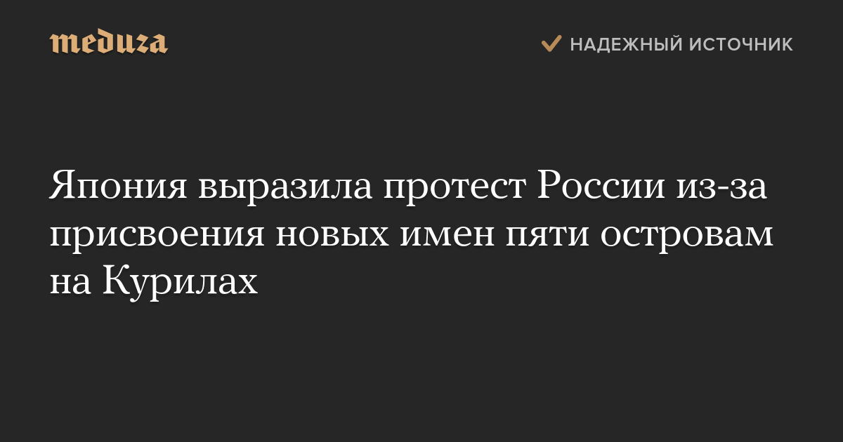 Правительство Японии направило России протест в связи с присвоением имен пяти островам Курильской гряды. Об этом объявил генеральный секретарь кабинета министров Японии Есихидэ Суга.
