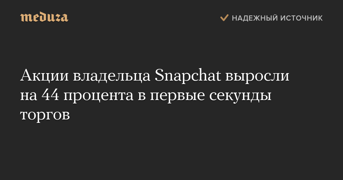 В первые секунды торгов акциями компании Snap, которой принадлежит сервис Snapchat, инвесторы подняли стоимость ценных бумаг на 44 процента. Первые сделки прошли в районе 24 долларов за акцию.
