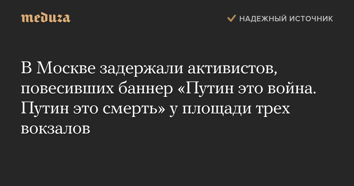 В Москве задержали троих активистов, вывесивших на мосту у Комсомольской площади баннер с текстом «Путин это война. Путин это смерть». Об этом сообщает «ОВД-Инфо» со ссылкой на задержанных.