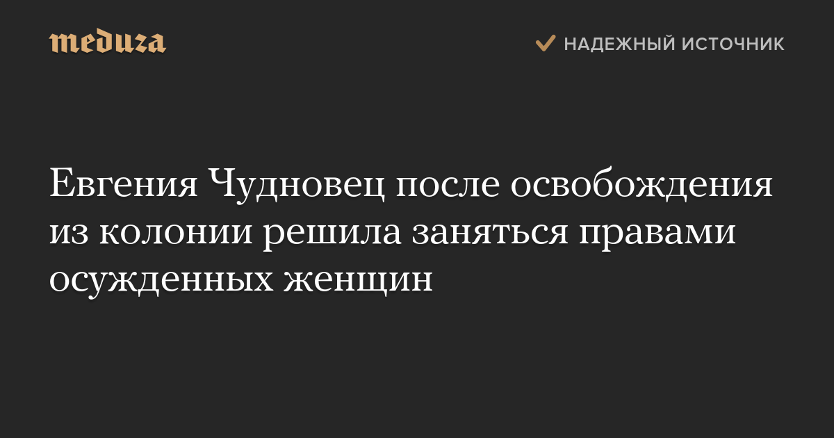 Евгения Чудновец, которую 6 марта освободили из нижнетагильской колонии, займется защитой прав осужденных женщин. Она рассказала, что этот вопрос волновал ее во время заключения, поскольку «там много таких, по ошибке осужденных».