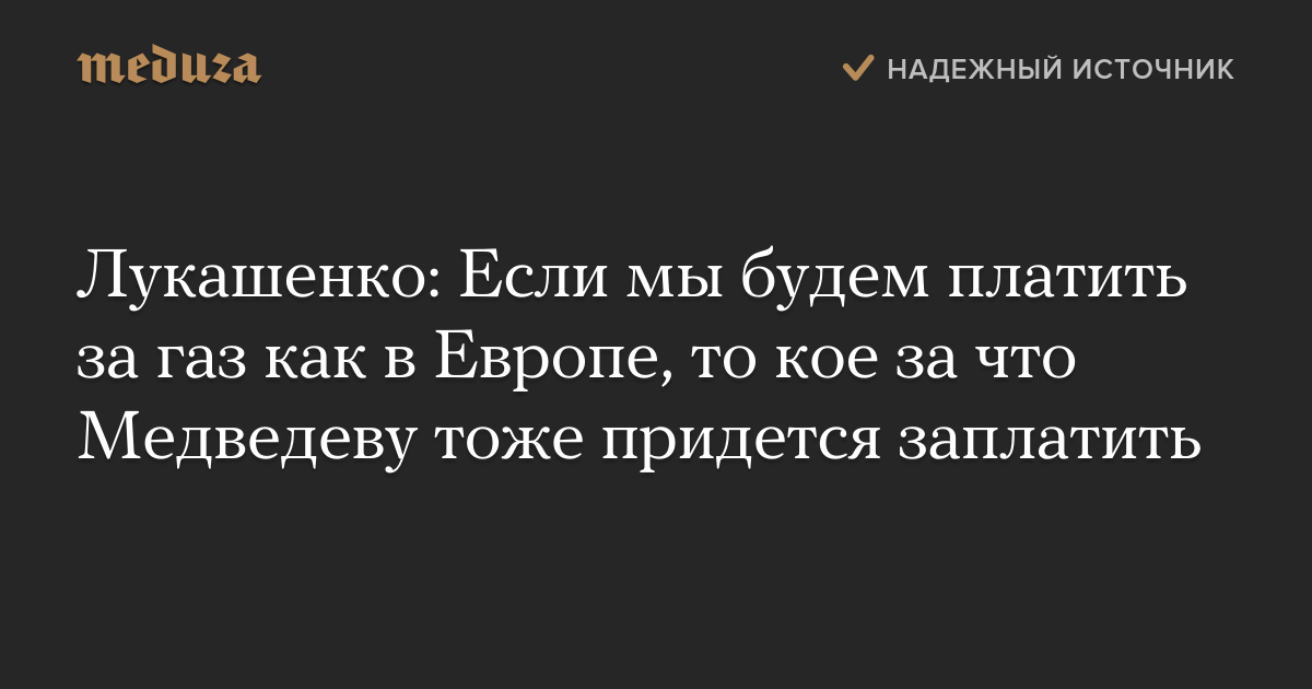 Президент Белоруссии Александр Лукашенко на совещании по вопросам развития страны заявил, что премьер-министру России Дмитрию Медведеву придется «кое за что заплатить» в случае, если Белоруссия будет вынуждена платить за российский газ столько же, сколько и европейские страны.