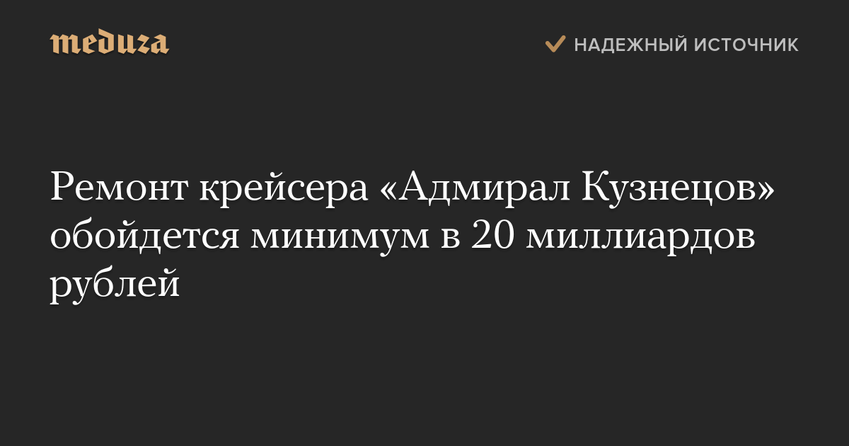 Эксперты, опрошенные изданием, отмечают, что затраты на ремонт «Адмирала Кузнецова» могут значительно превысить 20 миллиардов рублей, а затянуться работы могут на срок до пяти лет.