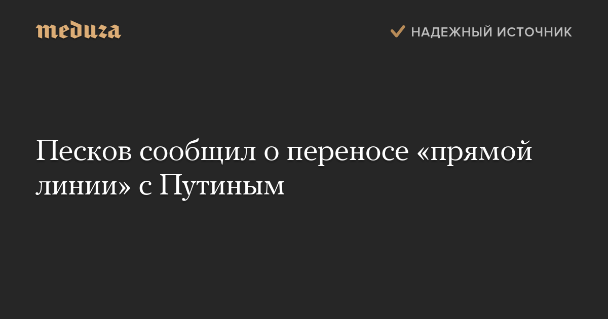 Ежегодная «прямая линия» с президентом РФ Владимиром Путиным состоится не в апреле, как в предыдущие годы, а позже. Об этом заявил пресс-секретарь президента Дмитрий Песков.