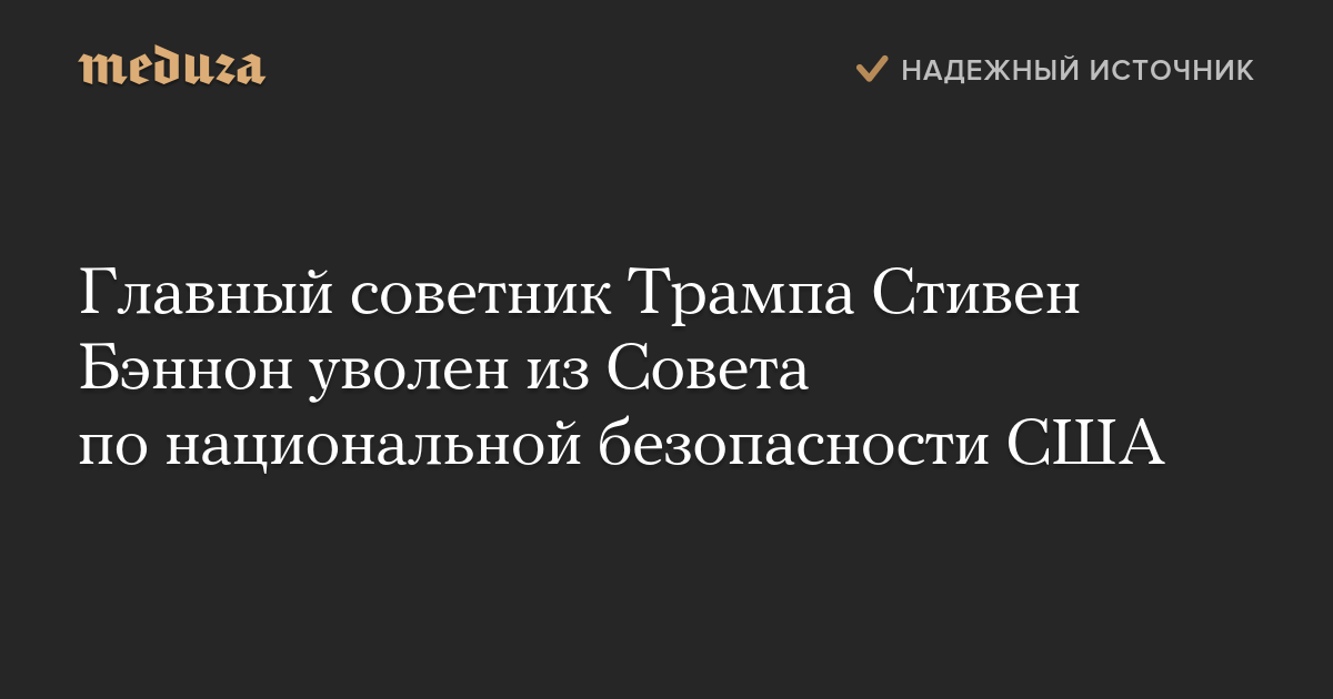 Советник Дональда Трампа Стивен Бэннон уволен с должности члена Совета по национальной безопасности США. Об этом 5 апреля сообщил Bloomberg.