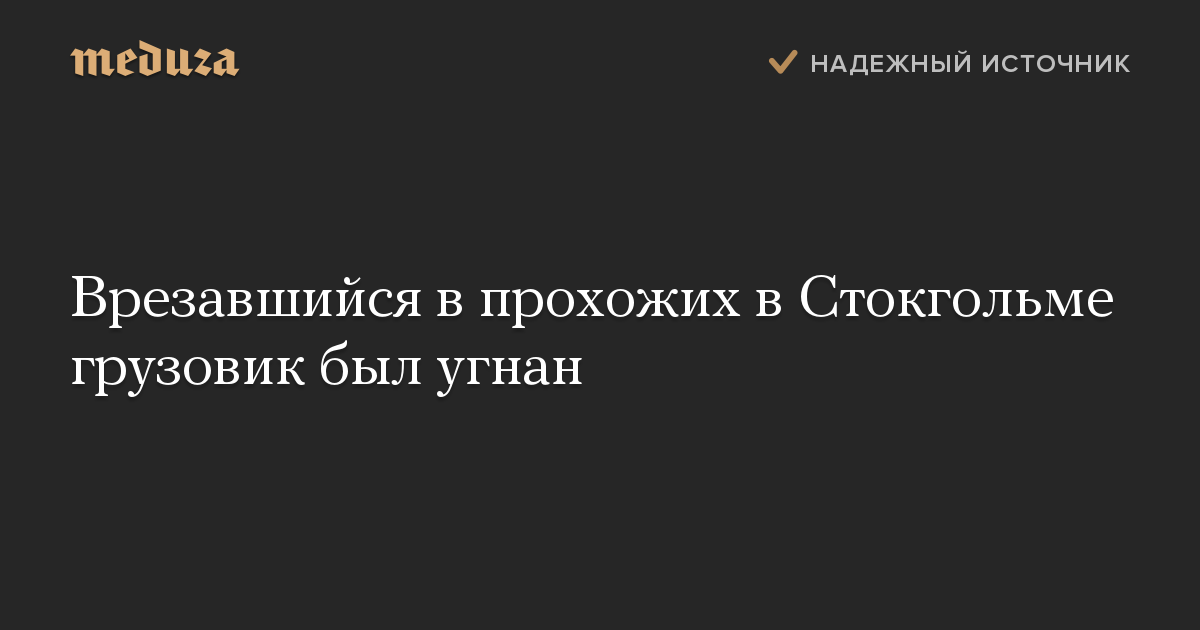 Грузовик, который врезался в прохожих в центре Стокгольма, был угнан. Об этом заявили агентству TT представители пивоваренной компании Spendrups, которой принадлежит грузовик.
