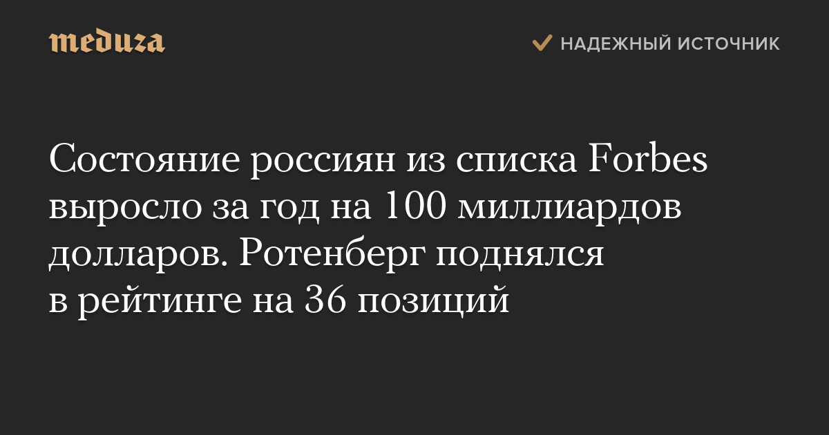 Состояние россиян из списка Forbes выросло за год на 100 миллиардов долларов. Ротенберг поднялся в рейтинге на 36 позиций