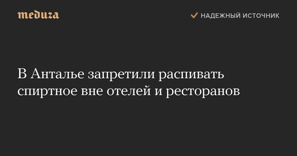 Власти турецкой провинции Анталья ввели запрет на употребление спиртных напитков за пределами отелей и заведений общественного питания. Предупреждение о запрете опубликовано на сайте Ассоциации туроператоров России.
