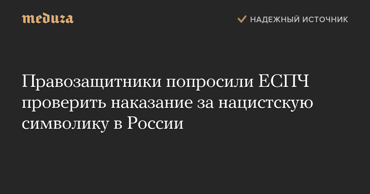 Юристы из группы «Агора» обратились в Европейский суд по правам человека (ЕСПЧ) с просьбой оценить правомерность применения в России статьи 20.3 КоАП, запрещающей пропаганду или публичное демонстрирование нацистской символики.