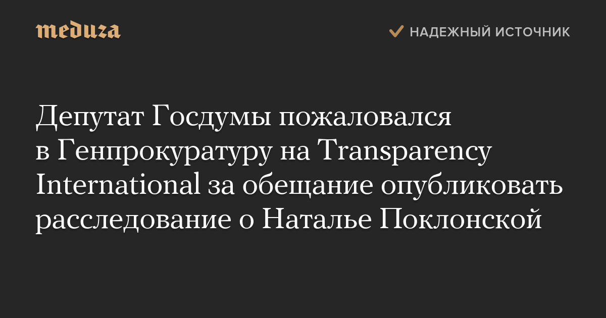 Депутат Госдумы пожаловался в Генпрокуратуру на Transparency International за обещание опубликовать расследование о Наталье Поклонской