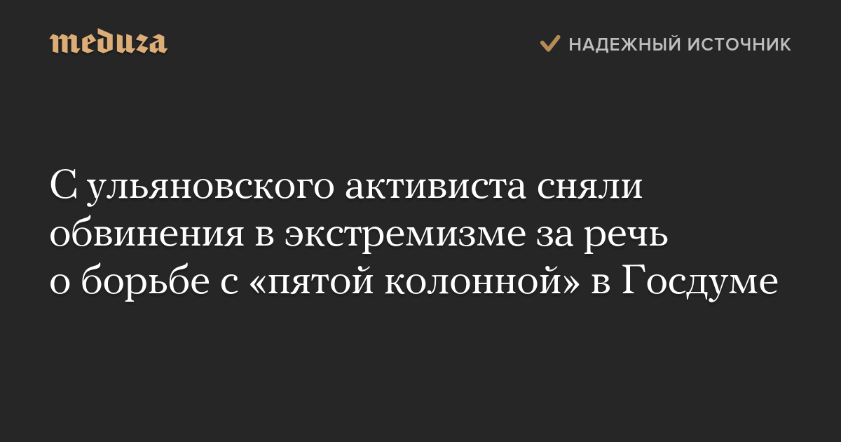 С ульяновского активиста сняли обвинения в экстремизме за речь о борьбе с «пятой колонной» в Госдуме