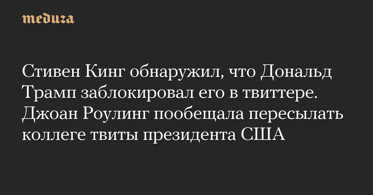 Стивен Кинг обнаружил, что Дональд Трамп заблокировал его в твиттере. Джоан Роулинг пообещала пересылать коллеге твиты президента США
