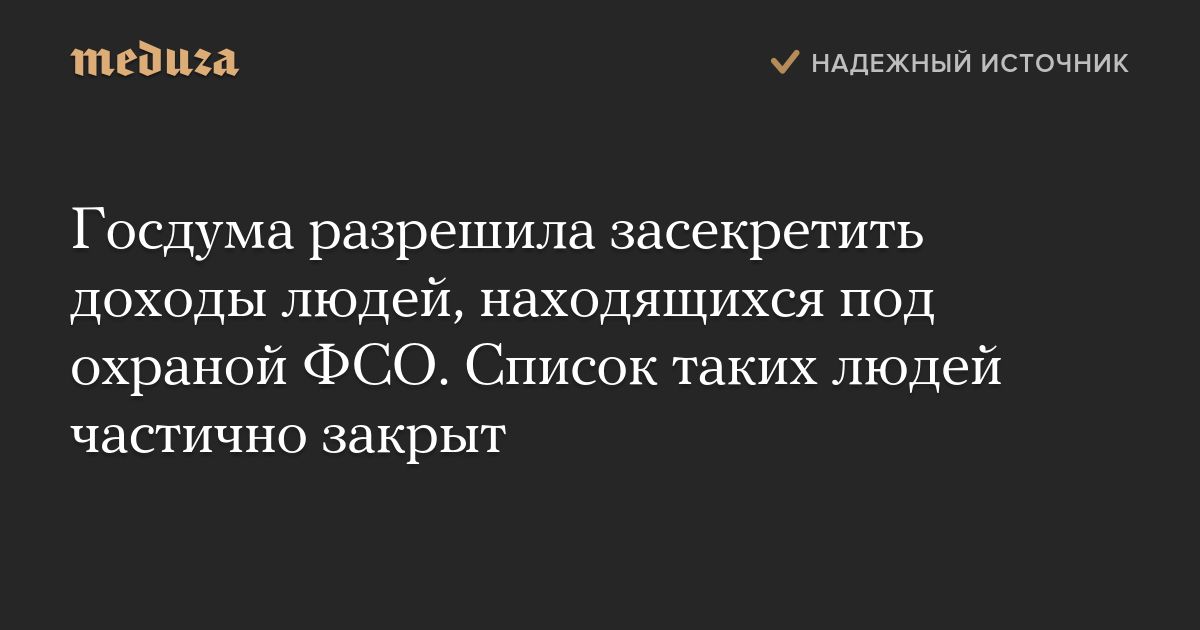 Госдума разрешила засекретить доходы людей, находящихся под охраной ФСО. Список таких людей частично закрыт