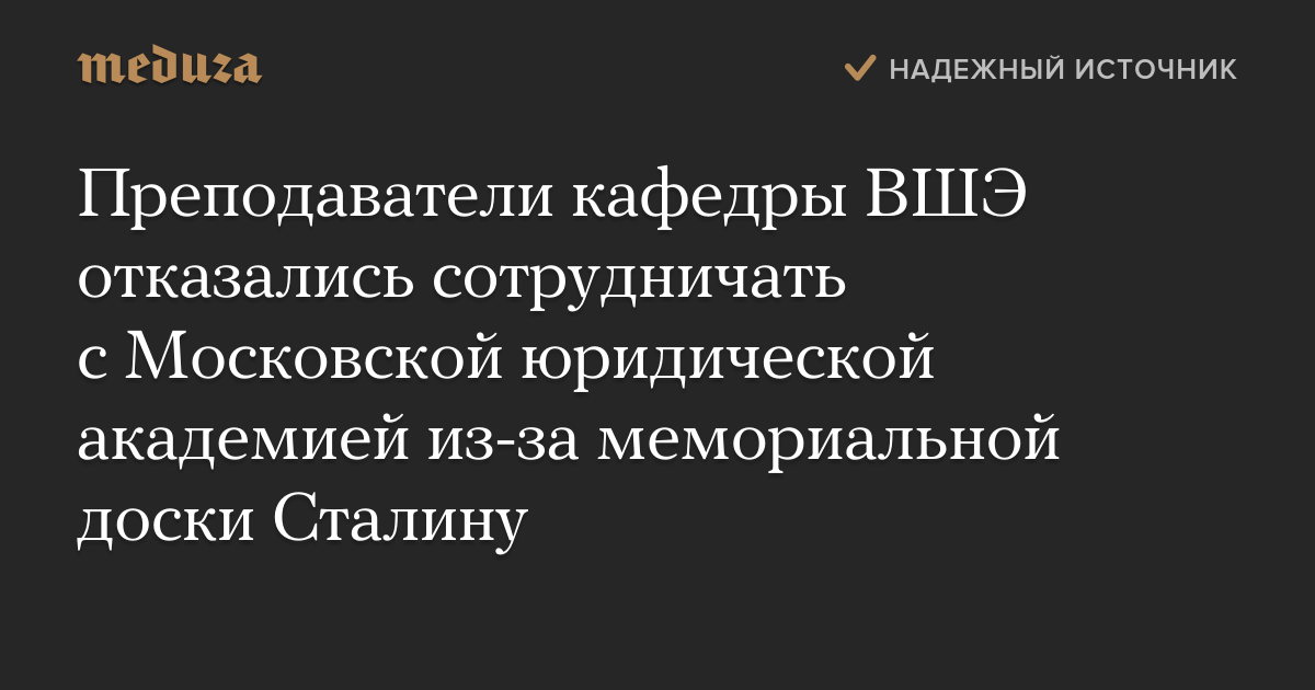 Преподаватели кафедры конституционного и административного права Высшей школы экономики отказались от участия в любых мероприятиях Московского государственного юридического университета (МГЮА), установившего мемориальную доску Сталину.