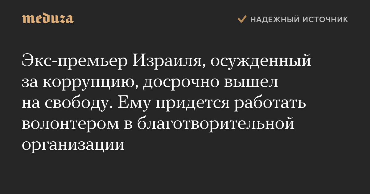 Экс-премьер Израиля, осужденный за коррупцию, досрочно вышел на свободу. Ему придется работать волонтером в благотворительной организации