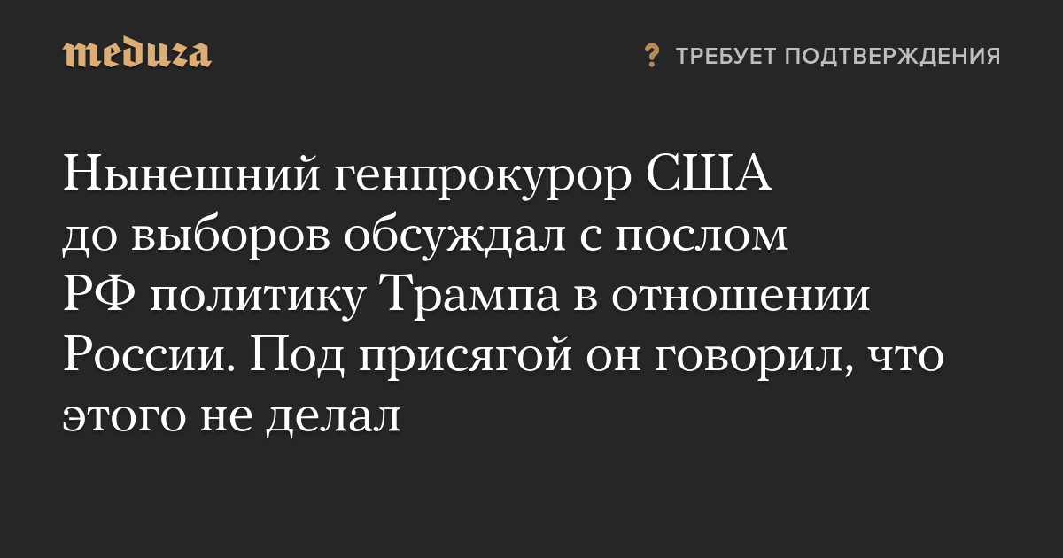 Нынешний генпрокурор США до выборов обсуждал с послом РФ политику Трампа в отношении России. Под присягой он говорил, что этого не делал