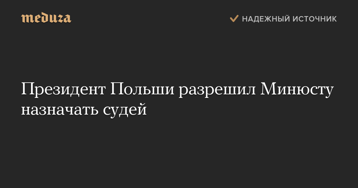Президент Польши Анджей Дуда подписал закон, который дает главе Минюста право назначать судей судов общей юрисдикции без согласования с судебными властями. Подписанный Дудой закон был одним из трех в пакете судебной реформы.