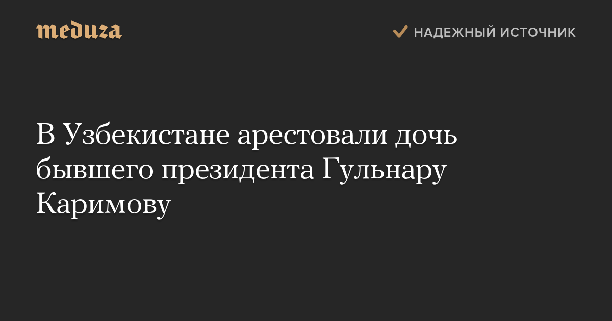 В Узбекистане арестована Гульнара Каримова, дочь бывшего президента страны Ислама Каримова. Ей предъявлено обвинение по шести статьям Уголовного кодекса — о мошенничестве, сокрытии иностранной валюты, нарушении таможенного законодательства, нарушение правил торговли или оказания услуг, подделке документов и легализации доходов, полученных преступным путем.