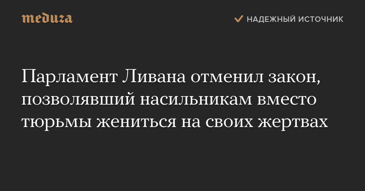 Парламент Ливана 16 августа отменил 522-ю статью уголовного кодекса, которая освобождала от наказания насильников, женившихся на своих жертвах.