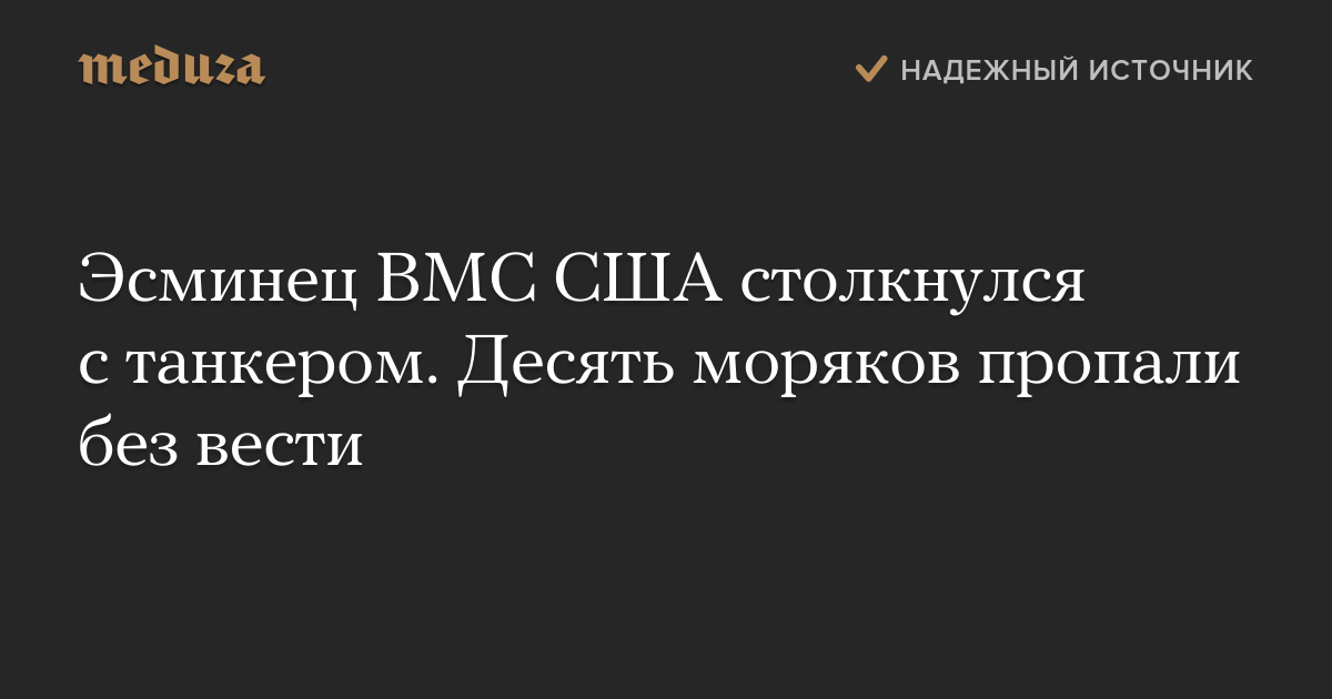 Американский эсминец «Джон С. Маккейн» в Малаккском проливе к востоку от Сингапура столкнулся с танкером. Пять моряков ВМС США получили травмы, еще 10 американских военнослужащих числятся пропавшими без вести.