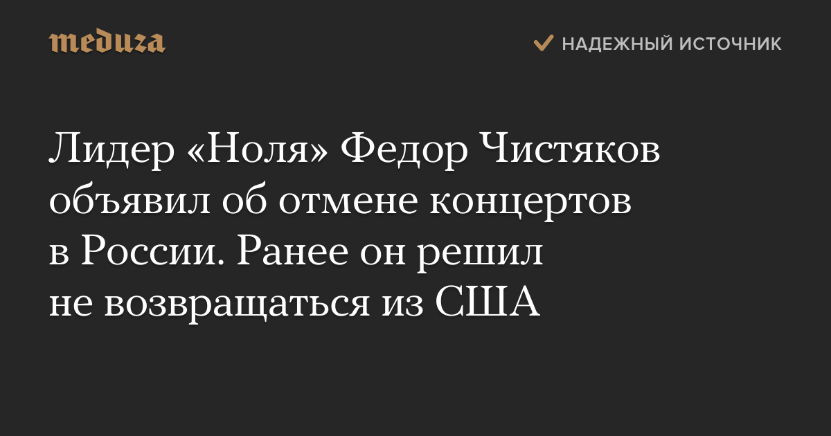 Лидер «Ноля» Федор Чистяков объявил об отмене концертов в России. Ранее он решил не возвращаться из США