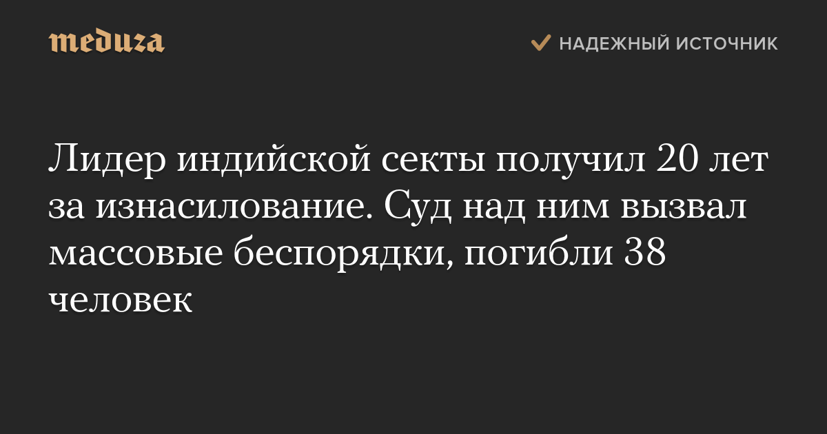 Лидер индийской секты «Дера Саша Сауда» Рам Рахим Сингх приговорен к 20 годам тюрьмы по обвинению в изнасиловании двух своих последовательниц. Об этом сообщает индийское агентство ANI.