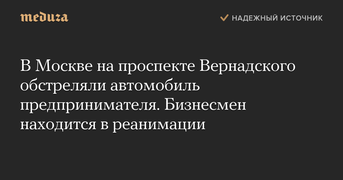 В Москве на проспекте Вернадского обстреляли автомобиль предпринимателя. Он получил не менее двух огнестрельных ранений и находится в реанимации. Об этом сообщают ТАСС и «Интерфакс».
