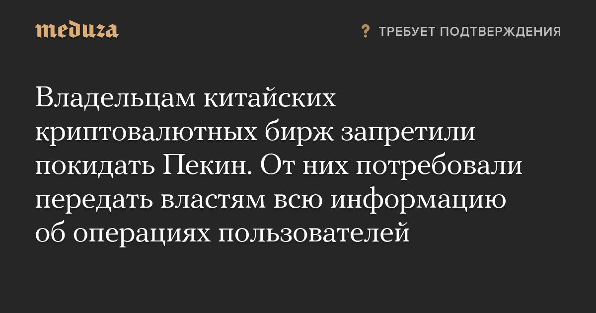 Владельцам китайских криптовалютных бирж запретили покидать Пекин. От них потребовали передать властям всю информацию об операциях пользователей