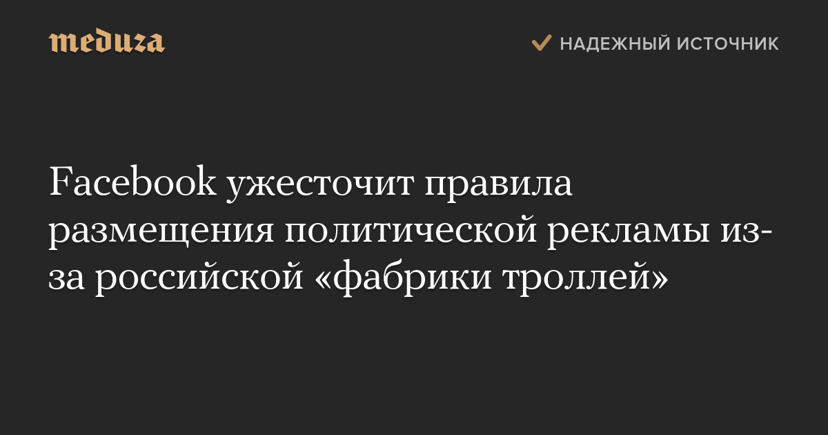 Facebook ужесточит правила размещения политической рекламы из-за российской «фабрики троллей»