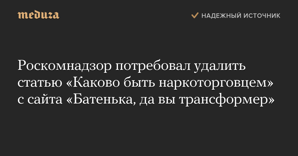 Роскомнадзор потребовал удалить статью «Каково быть наркоторговцем» с сайта «Батенька, да вы трансформер»
