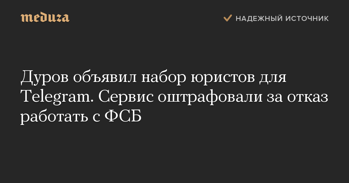 Дуров объявил набор юристов для Telegram. Сервис оштрафовали за отказ работать с ФСБ