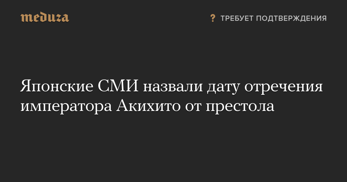 В свою очередь в пресс-службе правительства Японии даты, названные в публикации Asahi Shimbun, не подтвердили. «Мы не знаем ни об этой публикации, ни о названных в ней датах», — заявила пресс-служба, добавив, что обсуждение процедуры отречения Акихито продолжается.