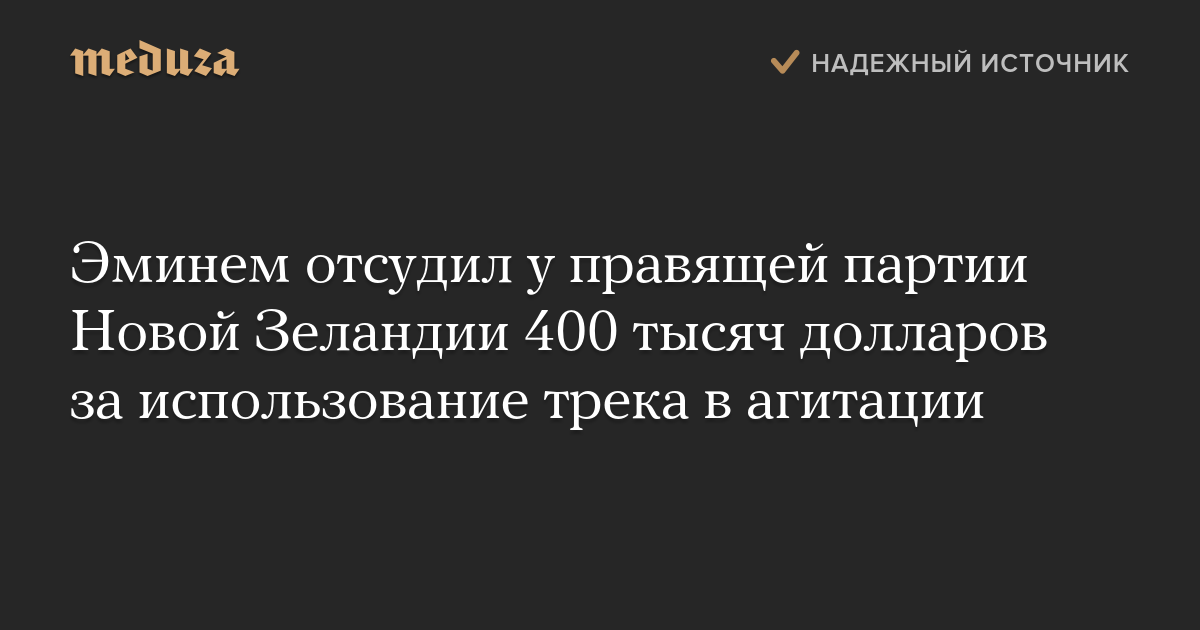 Американский рэпер Эминем выиграл суд против правящей Национальной партии Новой Зеландии за использование трека «Lose Yourself» в политической рекламе. Теперь партия должна выплатить исполнителю 600 тысяч новозеландских долларов (412 тысяч долларов США).