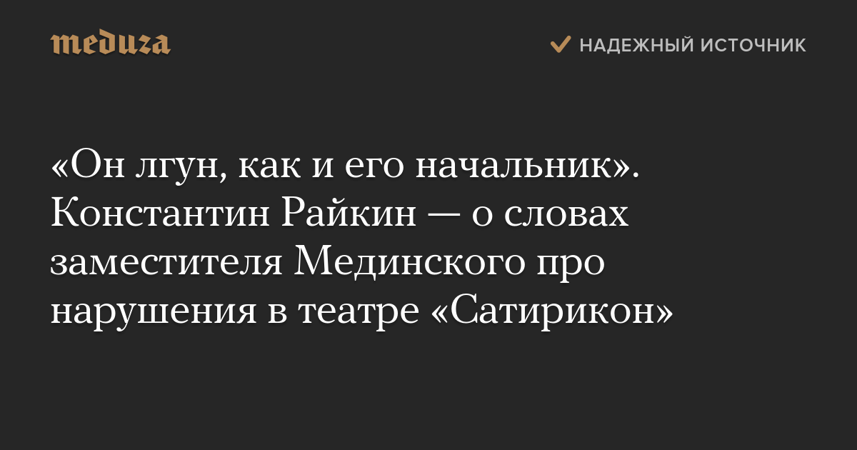 Константин Райкин 13 ноября призвал «как-то урезонить» министра культуры России Владимира Мединского и поставить его на место. Худрук «Сатирикона» при этом назвал министра «начальником нравственности всей Руси, директором честности и доктором исторических и политических наук».