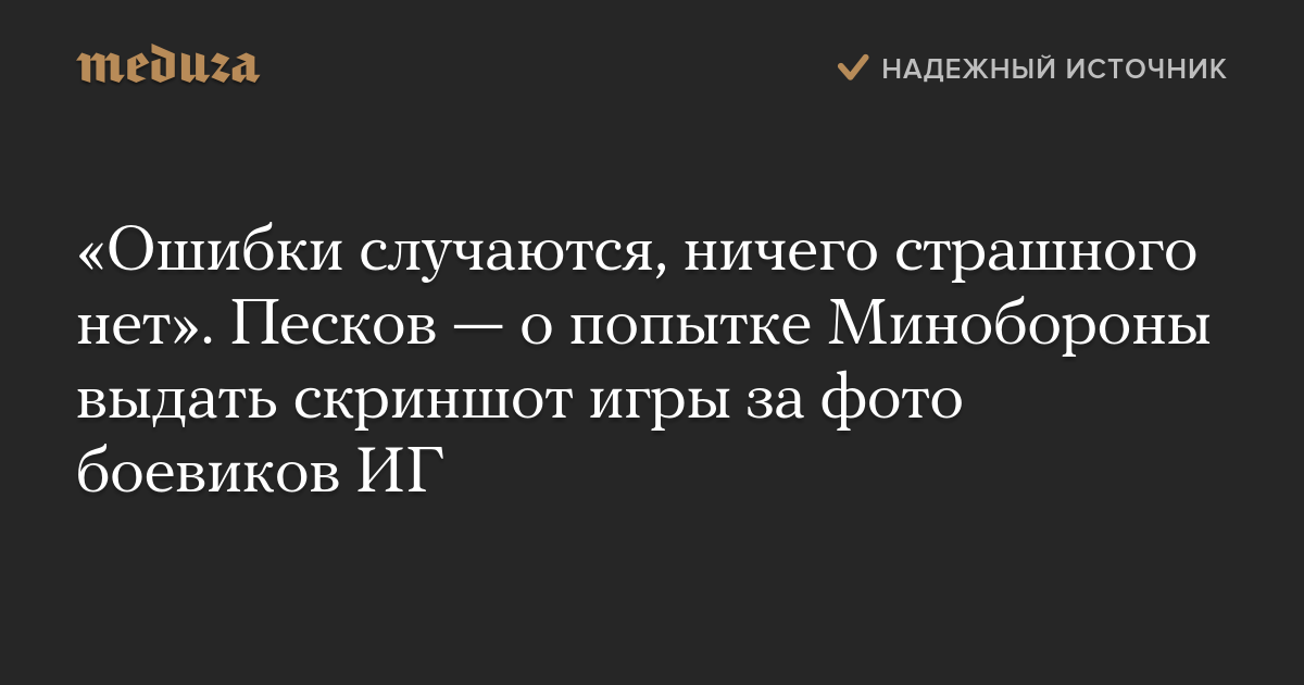 Пресс-секретарь президента РФ Дмитрий Песков, комментируя публикацию министерством обороны скриншота игры под видом фотографий боевиков «Исламского государства», призвал «не преувеличивать значение ошибки».