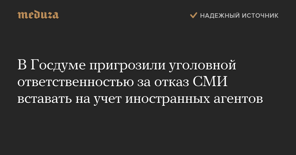 В Госдуме пригрозили уголовной ответственностью за отказ СМИ вставать на учет иностранных агентов