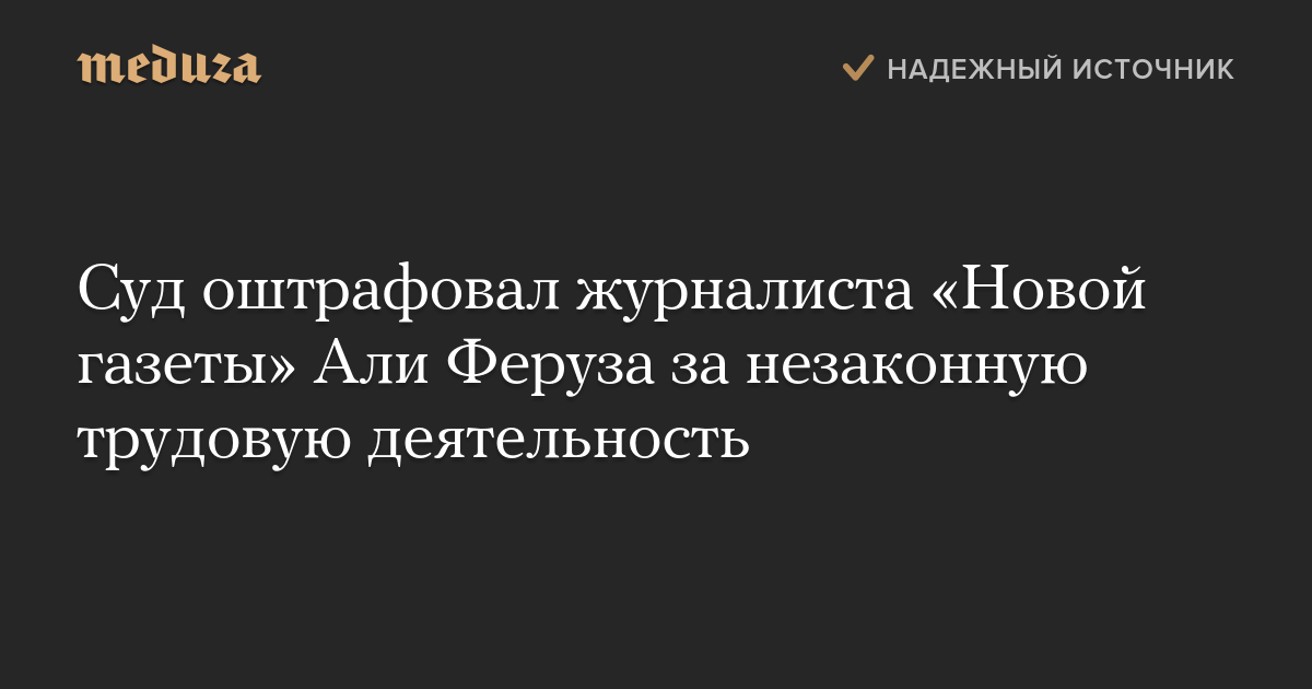 Басманный суд Москвы оштрафовал на пять тысяч рублей журналиста «Новой газеты» Али Феруза (Худоберди Нурматова), признав его виновным в незаконной трудовой деятельности на территории Москвы (часть 2 статьи 18.10 КоАП РФ). Об этом сообщает «Интерфакс».