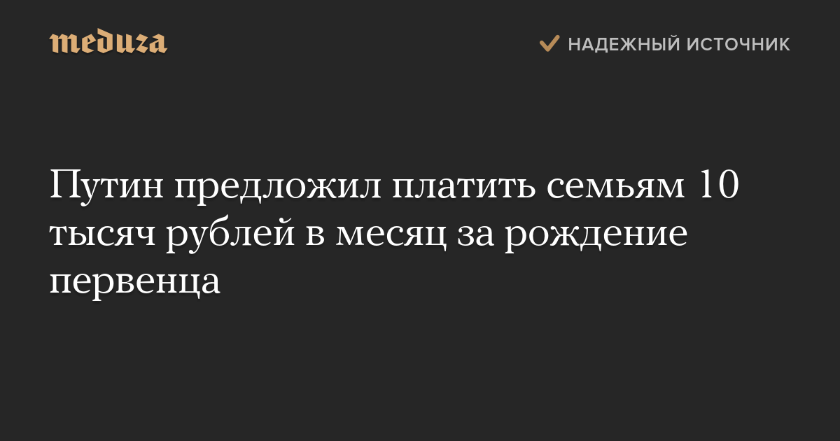 Президент России Владимир Путин предложил ввести ежемесячные выплаты для семей после рождения первенца, чтобы стимулировать рождаемость. Выплаты, по словам президента, составят в среднем 10,5 тысячи рублей в месяц и получать их можно будет до тех пор, пока ребенку не исполнится полтора года.