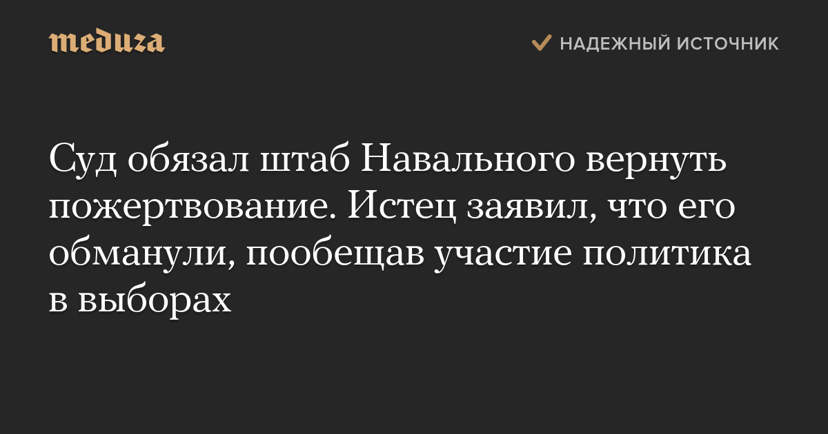 Суд обязал штаб Навального вернуть пожертвование. Истец заявил, что его обманули, пообещав участие политика в выборах