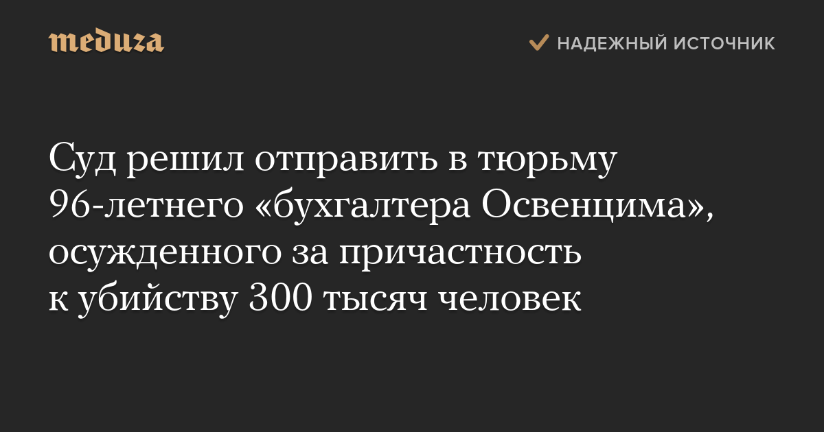 Суд решил отправить в тюрьму 96-летнего «бухгалтера Освенцима», осужденного за причастность к убийству 300 тысяч человек