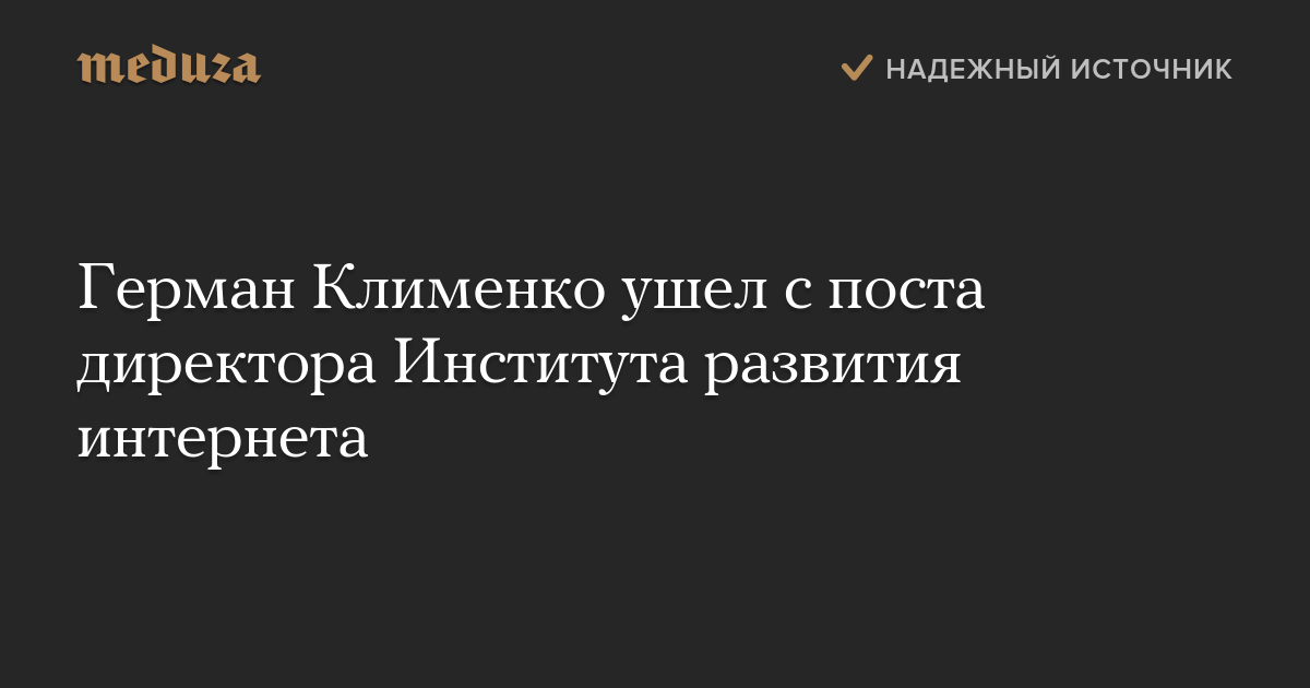 Советник президента России по развитию интернета Герман Клименко ушел с поста директора Института развития интернета. Одновременно он лишился должности председателя совета этой организации.