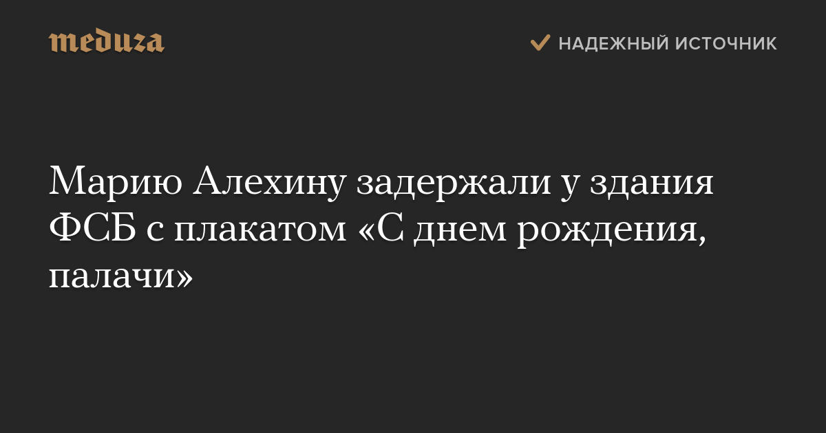 Полиция задержала около здания ФСБ на Лубянке участницу Pussy Riot Марию Алехину. Как рассказала «Медиазоне» активистка движения Ольга Борисова, Алехина подошла к зданию с плакатом «С днем рождения, палачи» (20 декабря отмечается столетие ВЧК).