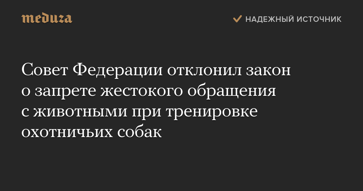 Совет Федерации отклонил закон, который запрещает жестокие методы тренировки охотничьих собак. За то, чтобы принять его, проголосовали только 43 сенатора, 78 выступили против, еще 22 воздержались. Закон был отправлен обратно в Госдуму для создания согласительной комиссии. Трансляция заседания СФ идет на ютьюбе.