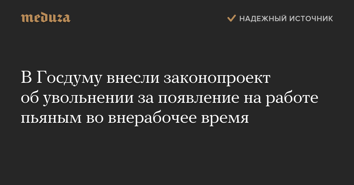 В Госдуму внесен законопроект поправок в Трудовой кодекс РФ, которые позволят увольнять сотрудников за появление на работе в нетрезвом виде во внерабочее время.