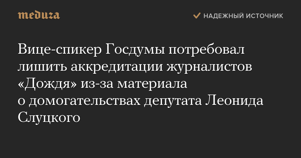 Вице-спикер Госдумы потребовал лишить аккредитации журналистов «Дождя» из-за материала о домогательствах депутата Леонида Слуцкого