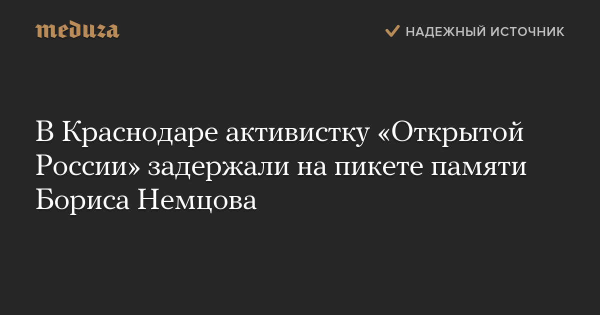 В Краснодаре 27 февраля полиция задержала координатора «Открытой России» Яну Антонову, которая проводила одиночный пикет памяти Бориса Немцова с плакатом «Герои не умирают».